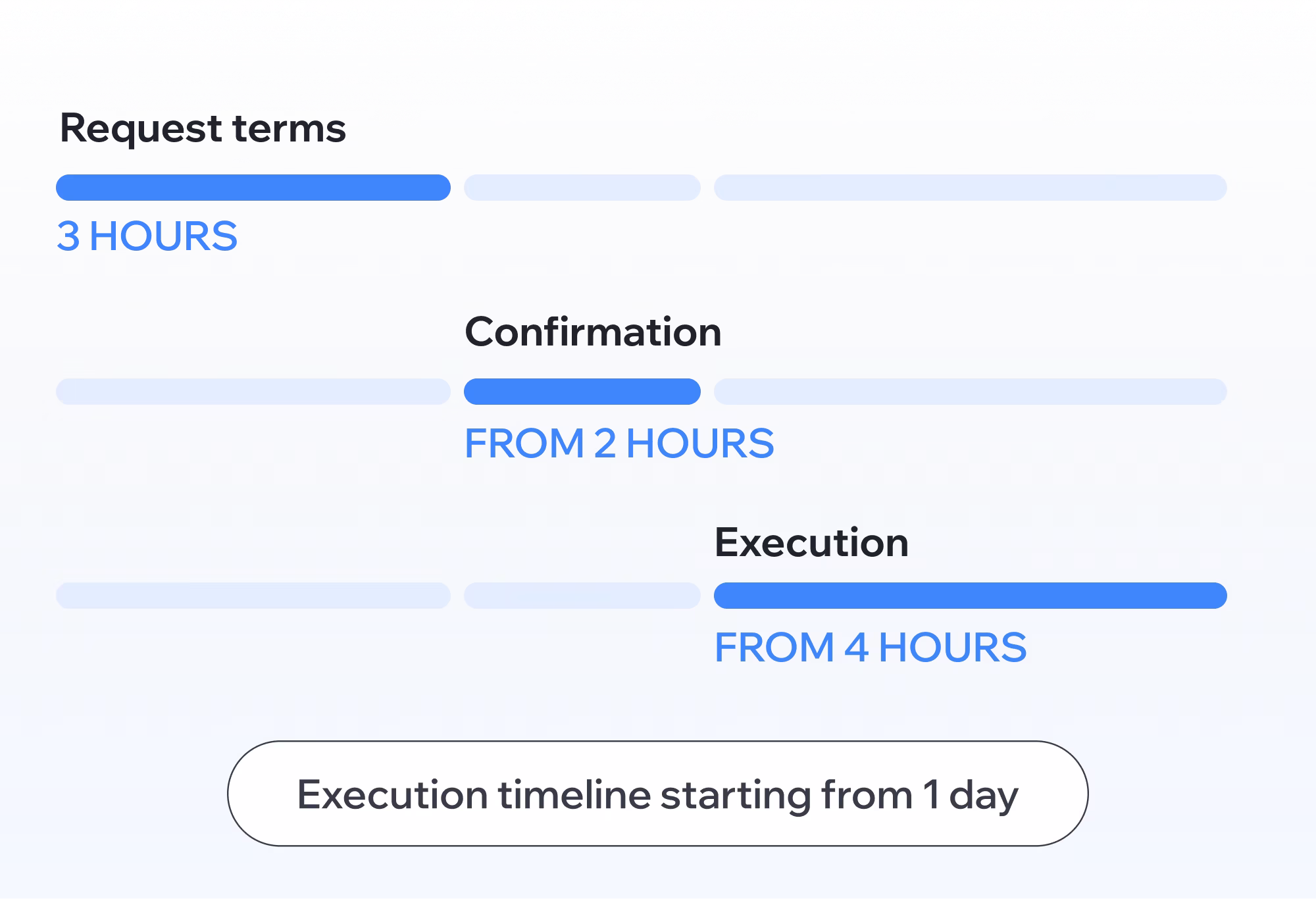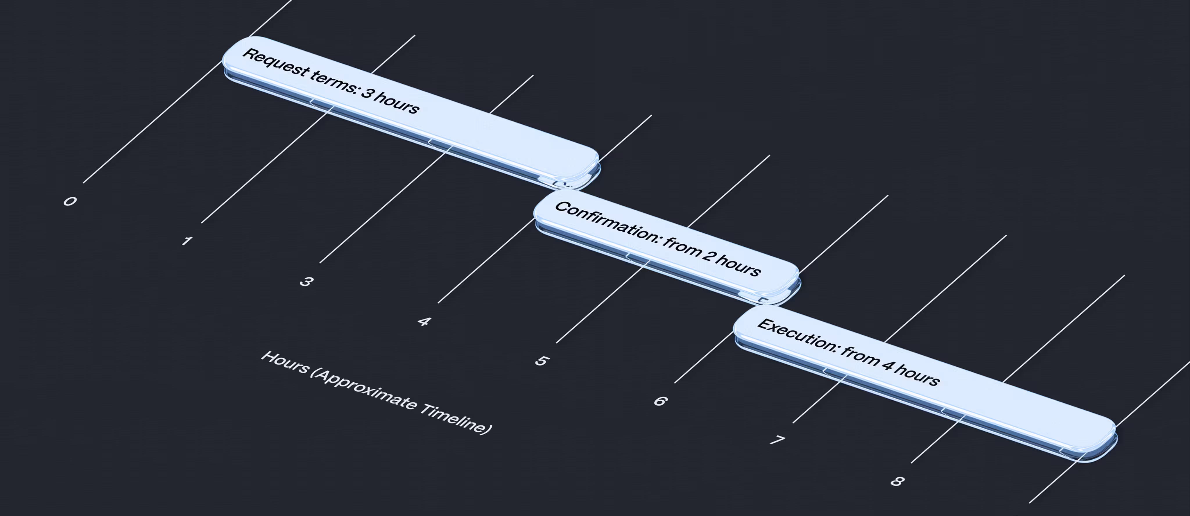 Most OTC transactions close less than 24 hours once all terms are finalized, depending on deal complexity.